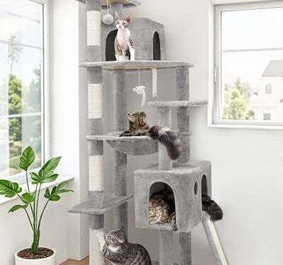 This Gitelsnour cat tree offers substantial structural integrity with its 63-inch height and dual-platform design, providing vertical territory essential for large cats’ territorial behaviors and stress reduction. The inclusion of multiple sisal scratching surfaces addresses the ethological need for claw maintenance and territorial marking through scent glands in paw pads. The hammock and basket configurations create enclosed spaces that align with feline preferences for secure resting areas, potentially reducing anxiety-related behaviors in multi-cat households. The tower’s design particularly benefits large-breed cats like Maine Coons or Ragdolls who require weight-bearing platforms and spacious perches. The anti-tip kit demonstrates appropriate safety consideration for active cats that may engage in vigorous play. However, the smoky gray plush covering may retain dander and require more frequent cleaning than lower-pile alternatives. The multi-level structure provides environmental enrichment that can help prevent obesity by encouraging climbing and jumping activities in sedentary indoor cats.